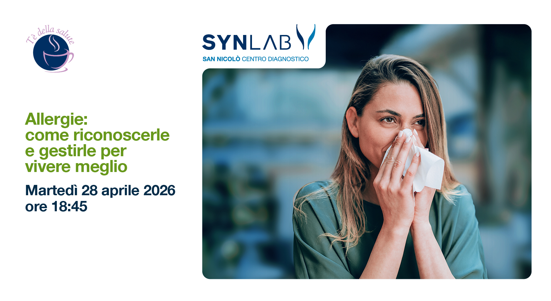 Partecipa al Tè della Salute “Allergie: come riconoscerle e gestirle per vivere meglio” che si terrà martedì 28 aprile alle ore 18:45 presso la sede SYNLAB San Nicolò Lecco 78.